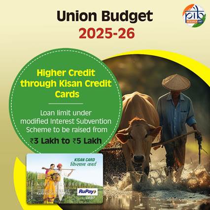 केसीसी योजना किसानों की वित्तीय आवश्यकताओं को पूरा करने में महत्वपूर्ण भूमिका निभाती है। संशोधित ब्याज छूट योजना के अंतर्गत ऋण सीमा को 3 लाख रुपये से बढ़ाकर 5 लाख रुपये करने के साथ; इस वर्ष का बजट सरकार द्वारा किसानों को सशक्त बनाने एवं कृषि उत्पादकता को बढ़ाने की प्रतिबद्धता को दर्शाता है।