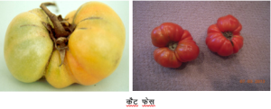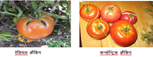 टमाटर के फलों में क्रैकिंग के दो अलग-अलग रूप होते हैं। रेडियल क्रैकिंग मुख्यतः फलों में दिखाई देते हैं जिसमें दरार फलों के ऊपरी सतह से निकलते हुए फलों के निचली सतह की ओर बढ़ते हैं । कन्सेन्ट्रिक क्रैकिंग मुख्यतः पूर्ण विकसित फलों में अंगूठी के छल्लों के निशान की तरह ऊपरी सतह पर दिखाई देते हैं। एक ही फल में दोनों तरह के विकार होना संभव है। क्रैकिंग तब होती है जब फल में आंतरिक विस्तार एपिडर्मिस के विस्तार से तेज होता है और परिणाम स्वरुप एपिडर्मिस विभाजित हो जाता है।