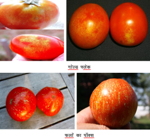 ज्यादातर मामलों में जब एक फल प्रभावित होता है तो दोनों विकार एक साथ पाए जाते हैं लेकिन इन विकारों को अलग – अलग समझा जाता है। पॉक्स, फलों के सतह पर अनियमित रूप से फैले हुए छोटे उभार या दरार होते हैं जो संख्या में काम या ज्यादा हो सकते हैं। वहीं गोल्ड फ्लेक में अपरिपक्व फलों के सतहों पर अनियमित आकार के छोटे हरे धब्बे दिखाई देते हैं जो फलों के पकने पर सुनहरे रंग के हो जाते हैं । इन विकारों से ग्रसित फल बाजार के लायक नहीं रहते हैं।