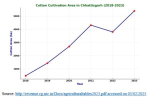 छत्तीसगढ़ में कपास की स्थिति : कपास सबसे महत्वपूर्ण नकदी फसलों में से एक है, जो भारत की कृषि अर्थव्यवस्था में महत्वपूर्ण योगदान देती है। अनुकूल जलवायु परिस्थितियों, उन्नत कृषि प्रथाओं और बढ़ती बाजार मांग के कारण छत्तीसगढ़ में कपास की खेती का रकबा पिछले पांच वर्षों में तेजी से बढ़ा है (2018 में 478 हेक्टेयर से 2023 में 5389 हेक्टेयर)। दुर्ग, बेमेतरा, राजनांदगांव, खैरागढ़-छुईखदान-गंडई, बलौदाबाजार, रायपुर जैसे प्रमुख कपास उत्पादक जिलों ने उच्च उत्पादन स्तर का प्रदर्शन किया है, जबकि कई अन्य जिलों में अनुकूल जलवायु और मिट्टी की स्थिति के कारण विस्तार की अप्रयुक्त क्षमता है।