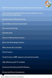 उत्पादन संबंधी प्रोत्साहन (पीएलआई) योजना निम्नलिखित 14 महत्वपूर्ण क्षेत्रों को विशेष प्रोत्साहन और परफॉर्मेंस फ्रेमवर्क के साथ कवर करती है।