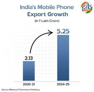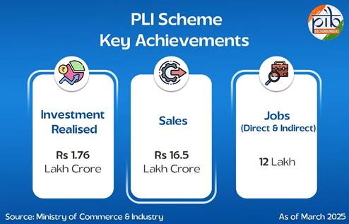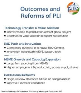 - पीएलआई योजना ने 14 प्रमुख क्षेत्रों में ₹1.76 लाख करोड़ का निवेश आकर्षित किया।