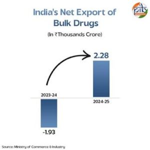किसी दौर में आवश्यक कच्चे माल के आयात पर अत्यधिक निर्भर रहने वाला भारत का फार्मा क्षेत्र अब दोबारा अपनी मजबूती प्राप्त कर रहा है। केंद्रित पीएलआई समर्थन की मदद से, देश एक शुद्ध आयातक (वित्त वर्ष 2021-22 में ₹1,930 करोड़ का घाटा) से थोक दवाओं का शुद्ध निर्यातक (वित्त वर्ष 2024-25 में ₹2,280 करोड़ का सरप्लस) बन गया है। शुरुआती तीन वर्ष में, पीएलआई के अंतर्गत फार्मा की बिक्री ₹2.66 लाख करोड़ को पार कर गई, जिसमें ₹1.70 लाख करोड़ का निर्यात शामिल है। मार्च 2025 तक इस क्षेत्र में कुल घरेलू मूल्य वर्धन 83.70% रहा है।