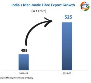 देश में एमएमएफ परिधान, एमएमएफ फैब्रिक्स और तकनीकी वस्त्र उत्पादों के उत्पादन को प्रोत्साहन देने के लिए सितंबर, 2021 में 10,683 करोड़ रुपये के आउटले के साथ कपड़ों के लिए पीएलआई योजना को मंजूरी दी गई थी, जिससे कपड़ा क्षेत्र को आकार और पैमाना हासिल करने और प्रतिस्पर्धा के योग्य बनाया जा सके। मानव निर्मित रेशे (एमएमएफ) का निर्यात वित्त वर्ष 2024-25 में बढ़कर लगभग ₹525 करोड़ (वित्त वर्ष 2023-24 में ₹499 करोड़ के मुकाबले) हो गया, जबकि तकनीकी कपड़ा निर्यात पिछले वर्ष के ₹200 करोड़ से बढ़कर ₹294 करोड़ हो गया। भारत सरकार विभिन्न योजनाओं/ पहलों के जरिए कपड़ा और परिधान निर्यात को सक्रिय रूप से प्रोत्साहन दे रही है, जैसे कि राज्य और केंद्रीय करों और शुल्कों में छूट (आरओएससीटीएल) योजना, जो परिधान, वस्त्रों और मेड-अप के लिए शून्य-रेटेड निर्यात का सहयोग करती है, जबकि अन्य कपड़ा उत्पादों को निर्यात उत्पादों पर शुल्कों और करों में छूट (आरओडीटीईपी) योजना के तहत कवर किया जाता है।
