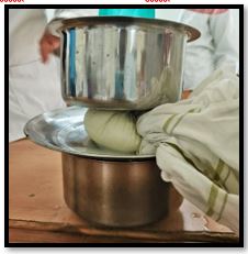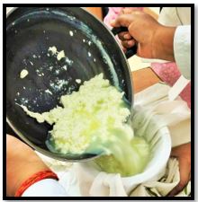 - छानना -जमे हुए मिश्रण को छलनी पर रखे ’’मलमल के कपड़े’’ में डालें। मट्ठे को पूरी तरह से अलग कर लें।