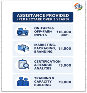 यह समग्र मदद सुनिश्चित करता है कि किसान न केवल जैविक प्रथाओं को अपनाएं बल्कि बेहतर आय सृजन के लिए प्रमाणन, ब्रांडिंग और बाजार लिंकेज के साथ भी सहायता प्राप्त करें।