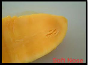 8. सॉफ्ट नोज़ः आम में सॉफ्ट नोज एक प्रमुख आंतरिक शारीरिक विकार है, जिसमें फल के शीर्ष या ’नाक’ वाला हिस्सा अत्यधिक पककर सड़ने जैसा, नरम और काला पड़ जाता है। यह समस्या मुख्य रूप से कैल्शियम की कमी और नाइट्रोजन/पोटेशियम के असंतुलन के कारण होती है। यह केंट जैसी संवेदी किस्मों में आम है, जो आंतरिक ऊतकों को नष्ट कर देती है।